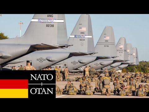 NATO. German paratroopers jump from USAF C-130 Hercules aircraft.
